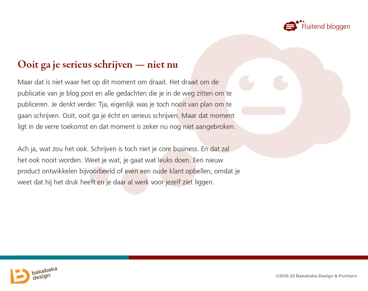 En de inhoud? Daar kan ik alleen maar positief over zijn. Om dit artikel te schrijven, heb ik het e-book nog eens doorgenomen en… het werkt! Op een vrolijke, makkelijke manier vertelt Anneke je hoe je fluitend kunt bloggen. In zeven stappen krijg je de juiste schrijfmindset. Bloggen is helemaal niet eng!