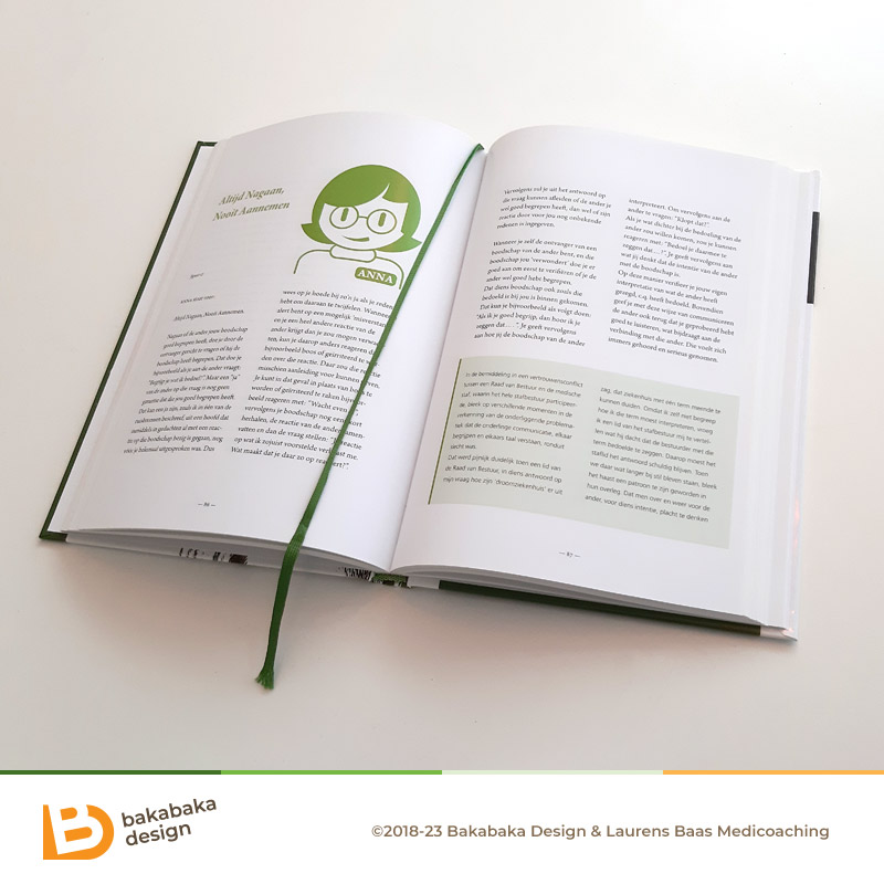 For the actual printing, Laurens asked BestelMijnBoek. The first edition was in paperback, the second was a hardcover. For that version, we used a bound bookmark. There were no precise colour descriptions for that, and we gambled on the ‘dark green’ option. It turned out to fit the colours in the design perfectly.