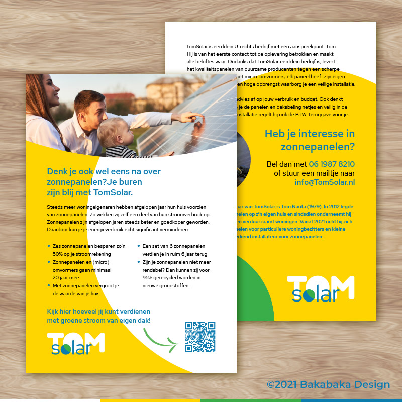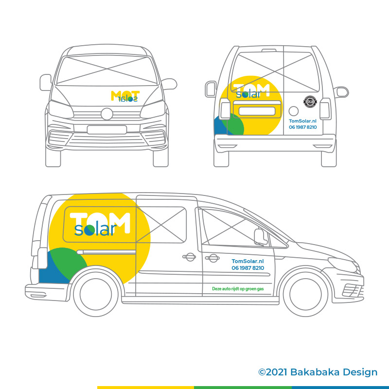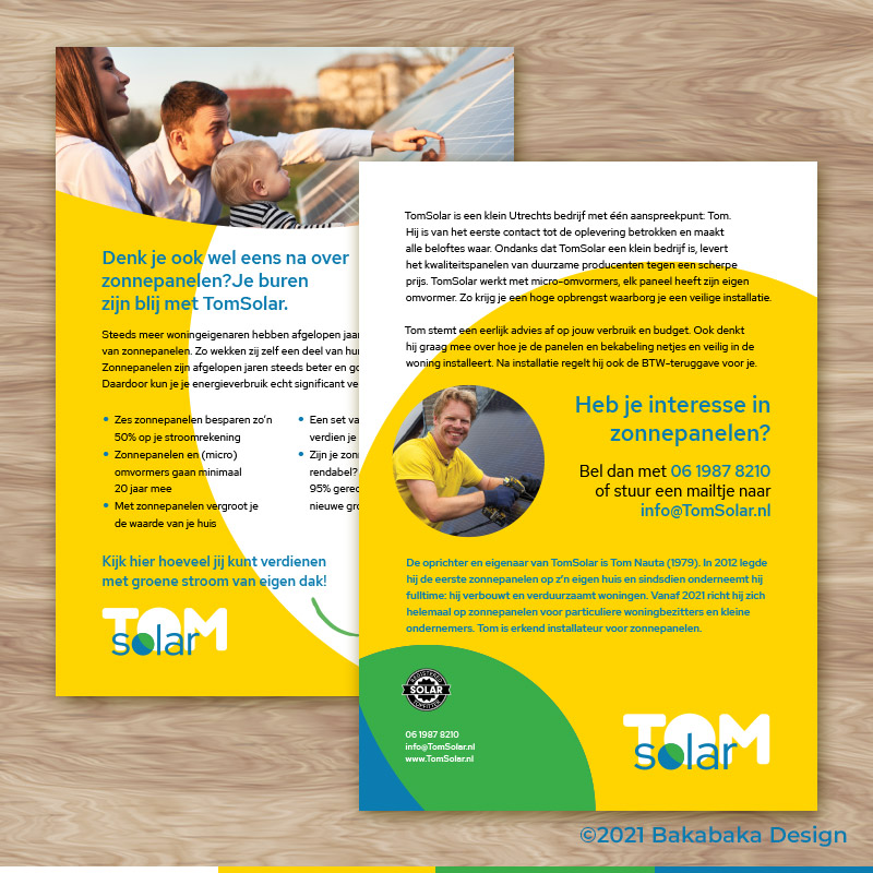 Yellow and white are dominant colours. Light, energetic, cheerful. A sunny brand for a sunny businessman. Are you thinking of having solar panels installed? Have Tom shine a light in your darkness!