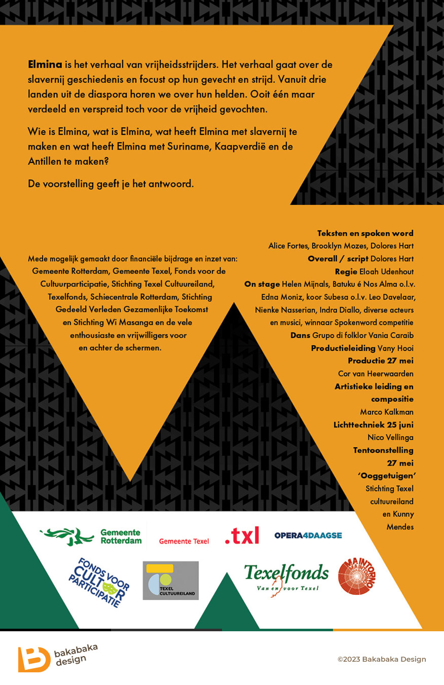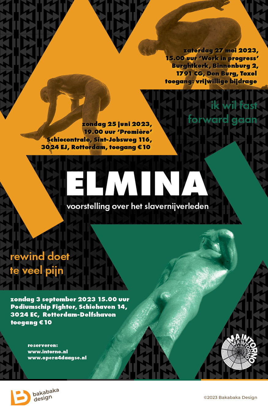 Het slavernijverleden is een gevoelig onderwerp. Toch aarzelden de culturele helden van theatergezelschap M.A. Intorno niet: ze maakten er een multidisciplinaire voorstelling over: Elimna. Met opera, toneel en spoken word. Ze vroegen mij om een poster voor deze theatervoorstelling.